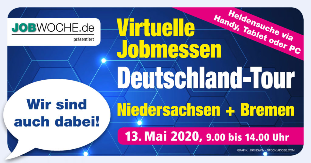 Heldensuche via Handy, Tablet oder PC am 13. Mai 2020, von 9.00 bis 14.00 Uhr, auf www.jobwoche.de/live. Finden Sie Job-, Aus- und Weiterbildungsangebote aus Ihrer Region!.